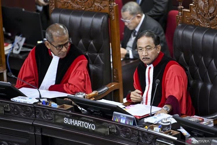 TIMES Cilegon/Ketua Mahkamah Konstitusi (MK) Suhartoyo (kanan) bersama Wakil Ketua MK Saldi Isra memimpin sidang pengucapan putusan perkara dilanjutkan atau tidak (dismissal) sengketa Pilkada 2024 di Gedung Mahkamah Konstitusi, Jakarta, Rabu (5/2/2025). (ANTARA)